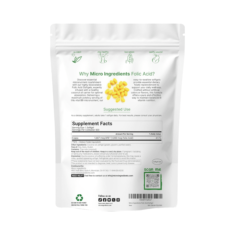 Cada bolsa contiene un total de 500 cápsulas blandas. Solo se necesita una cápsula por porción para recibir 1000 mcg de ácido fólico puro, lo que equivale a más de 16 meses de suplementación continua.