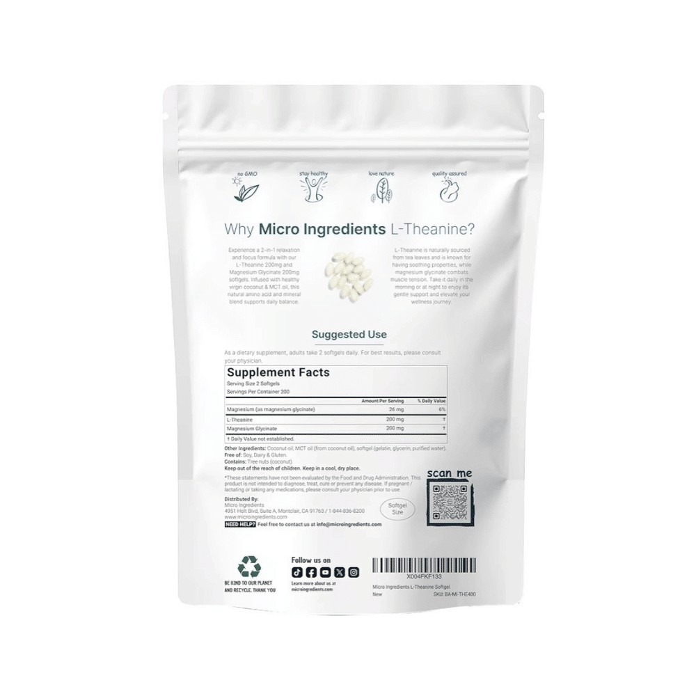 Micro Ingredients ofrece cápsulas blandas de aceite de coco con L-teanina y glicinato de magnesio 2 en 1, una fórmula de fácil absorción que combina aminoácidos naturales y minerales esenciales para promover relajación, salud muscular, equilibrio nervioso y enfoque mental. Cada bolsa contiene 400 cápsulas blandas fáciles de consumir, proporcionando 200 porciones de larga duración con 200 mg de L-teanina y 200 mg de glicinato de magnesio por porción.