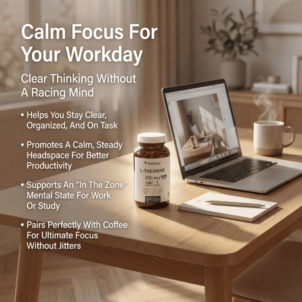 La L-Theanine favorece la relajación mental sin inducir sueño. Apoya el equilibrio emocional y ayuda a mantener claridad mental y concentración durante el día.