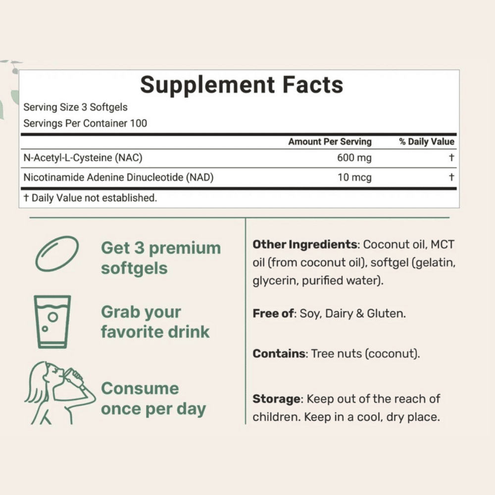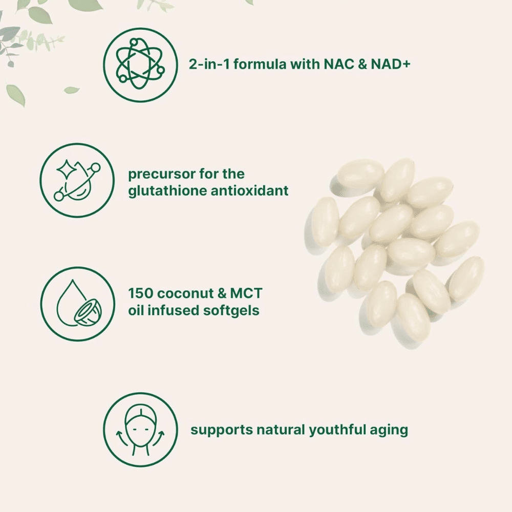 Cápsulas blandas que combinan NAC 600 mg con NAD+ en una base de aceite MCT de coco para una absorción optimizada.