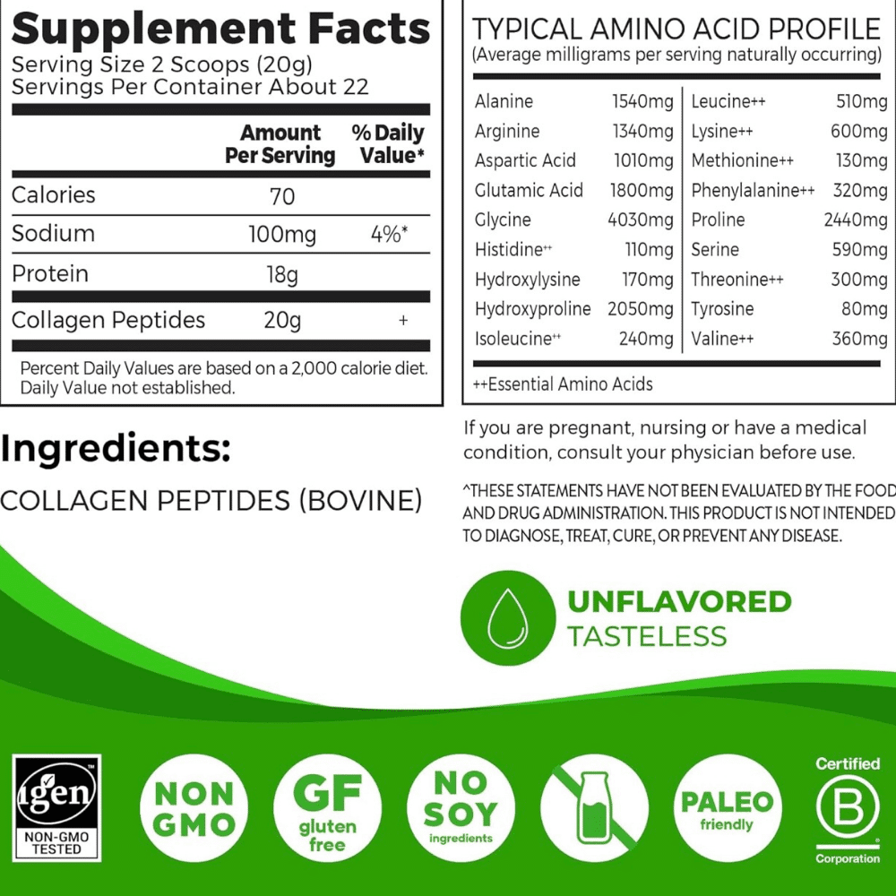 Incluye péptidos de colágeno bovino hidrolizados alimentados con pasto, criados en pastizales, y aminoácidos esenciales: lisina, leucina, histidina, metionina, isoleucina, fenilalanina, treonina, valina.