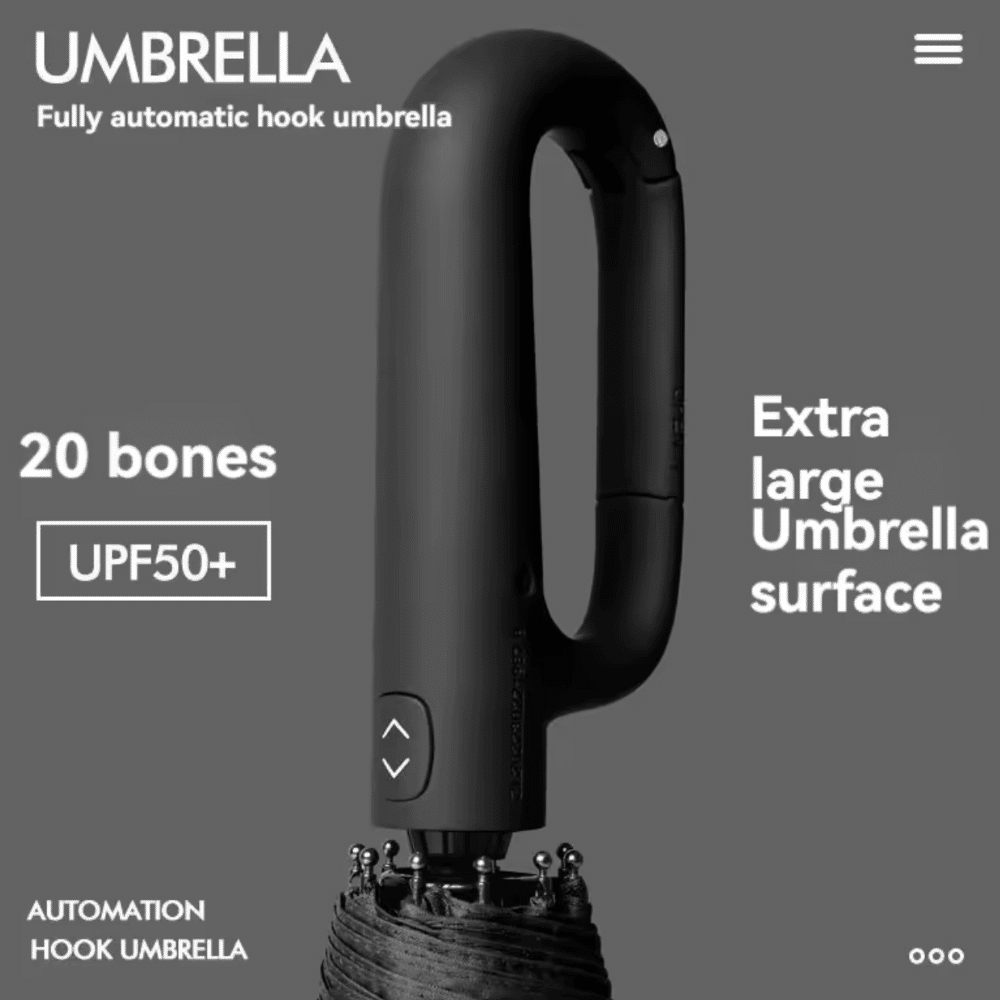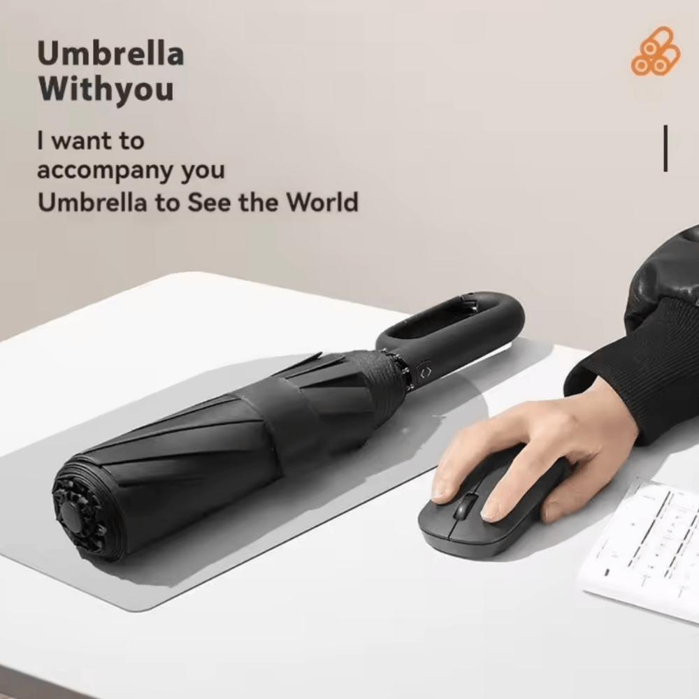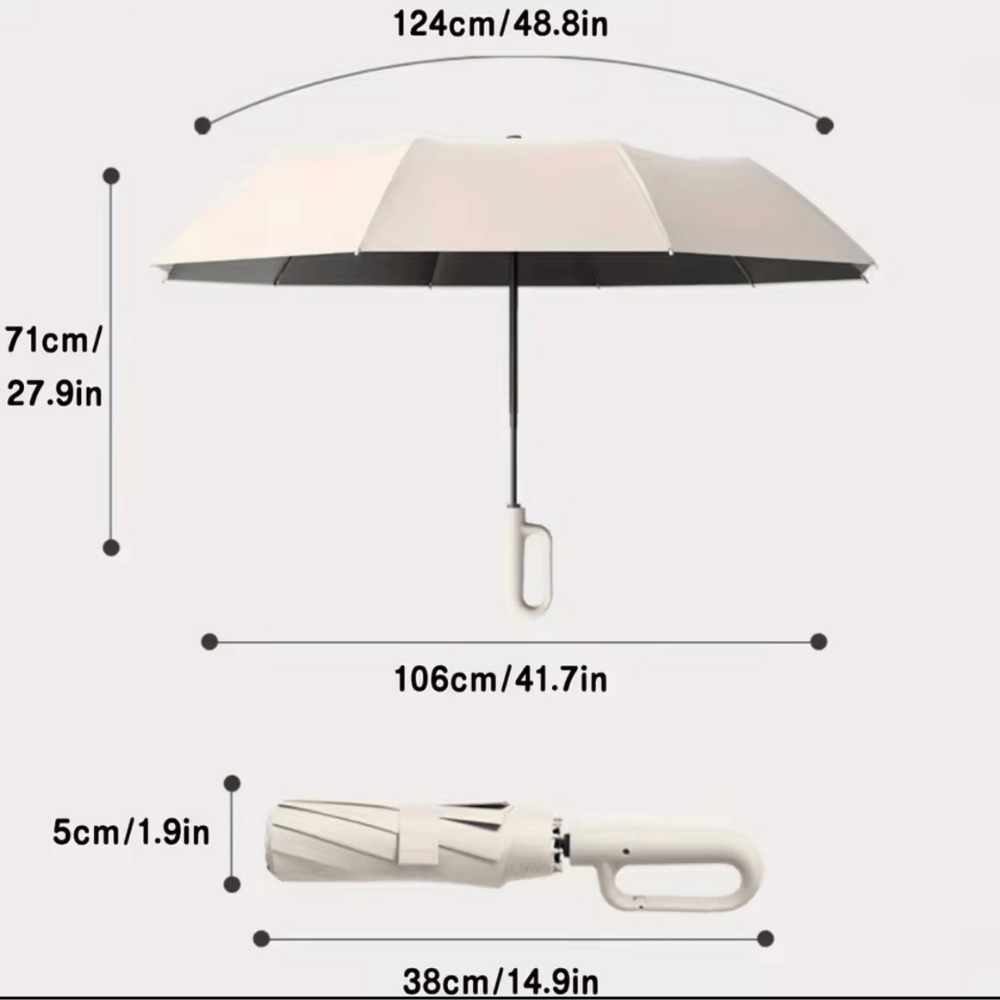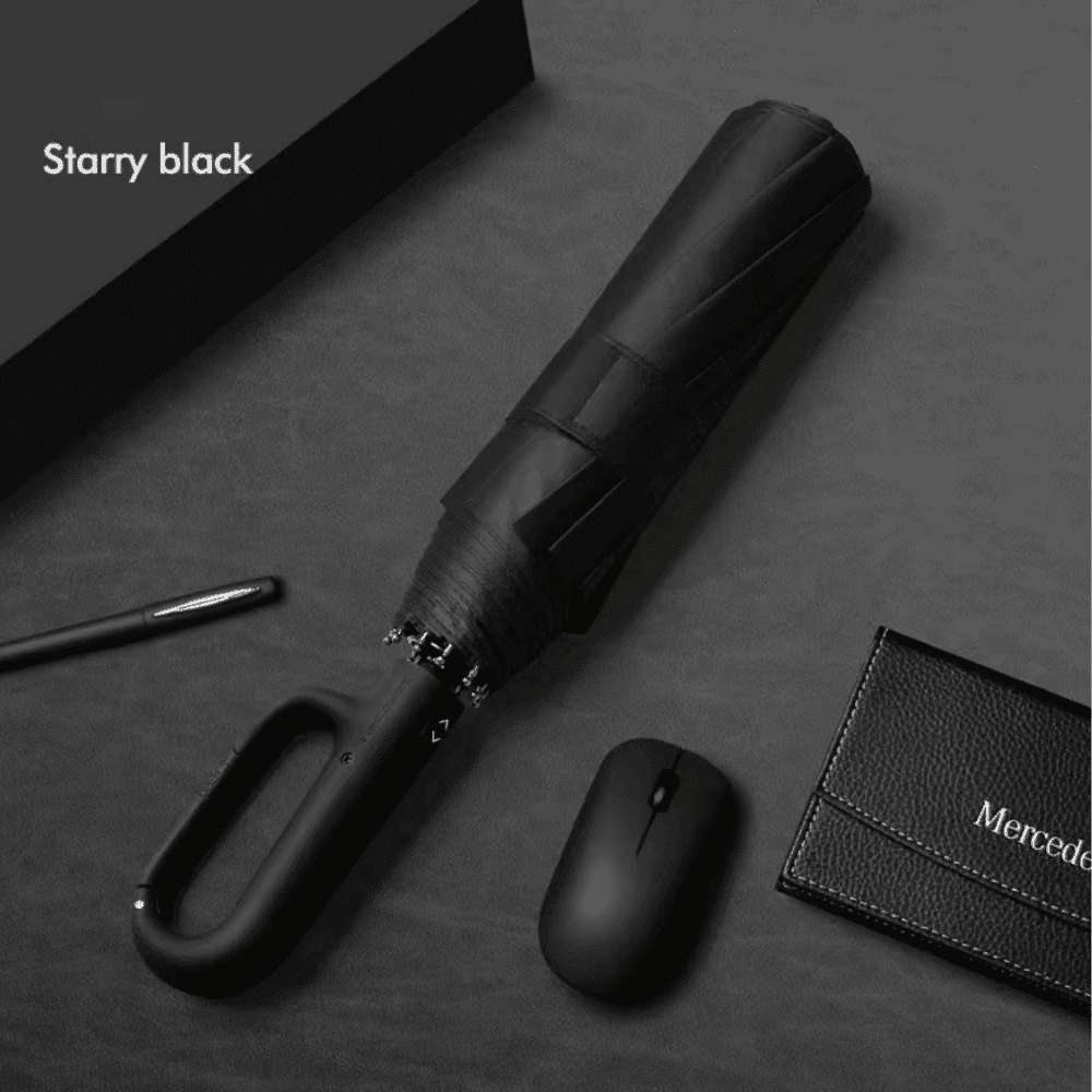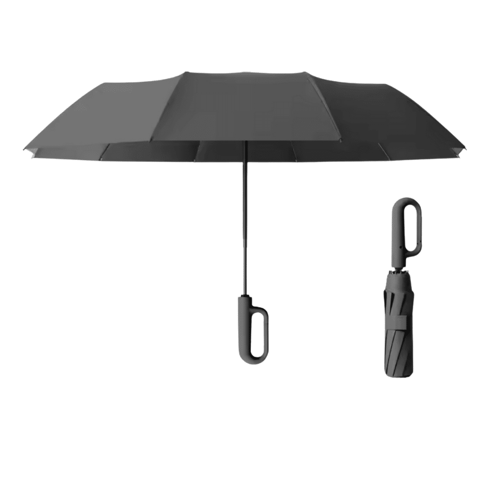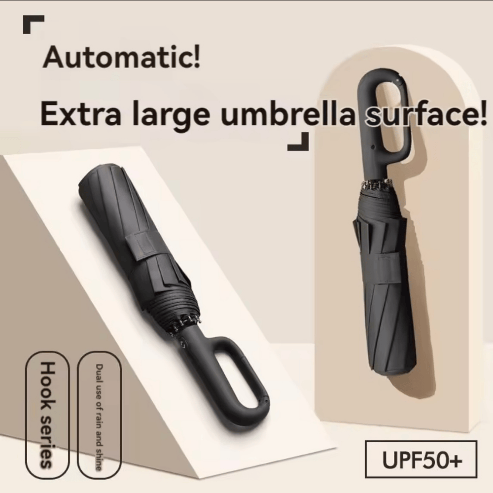 Sombrilla plegable automática de alta gama, ideal para protección contra lluvia o sol. Diseño elegante en color negro, con estructura reforzada y materiales resistentes.