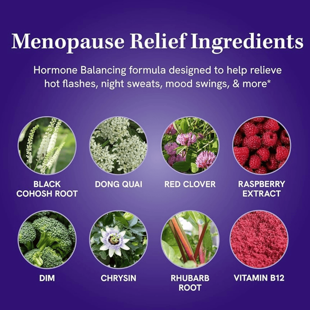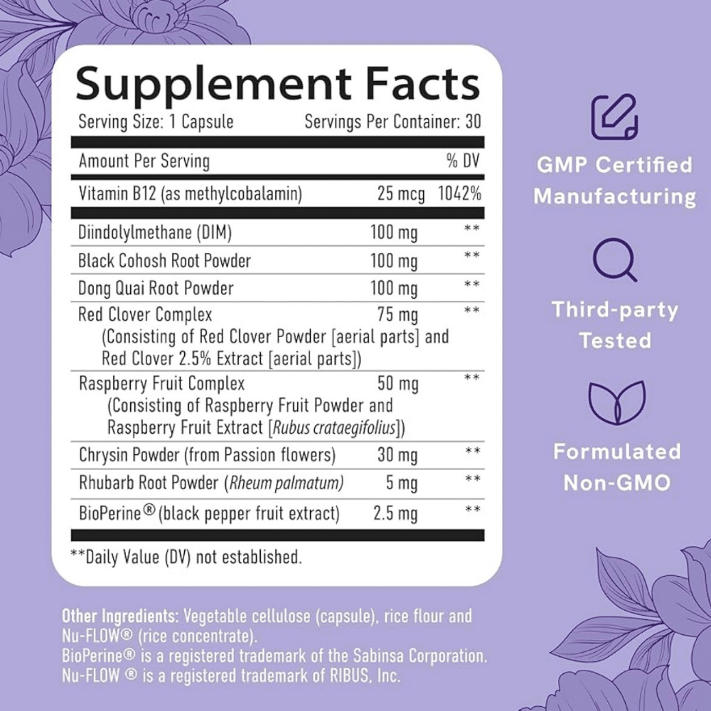 Incluye Cohosh Negro, Dong Quai, DIM, Trébol Rojo, Vitamina B12, Ruibarbo, Crisina, Frambuesa y BioPerine®.
